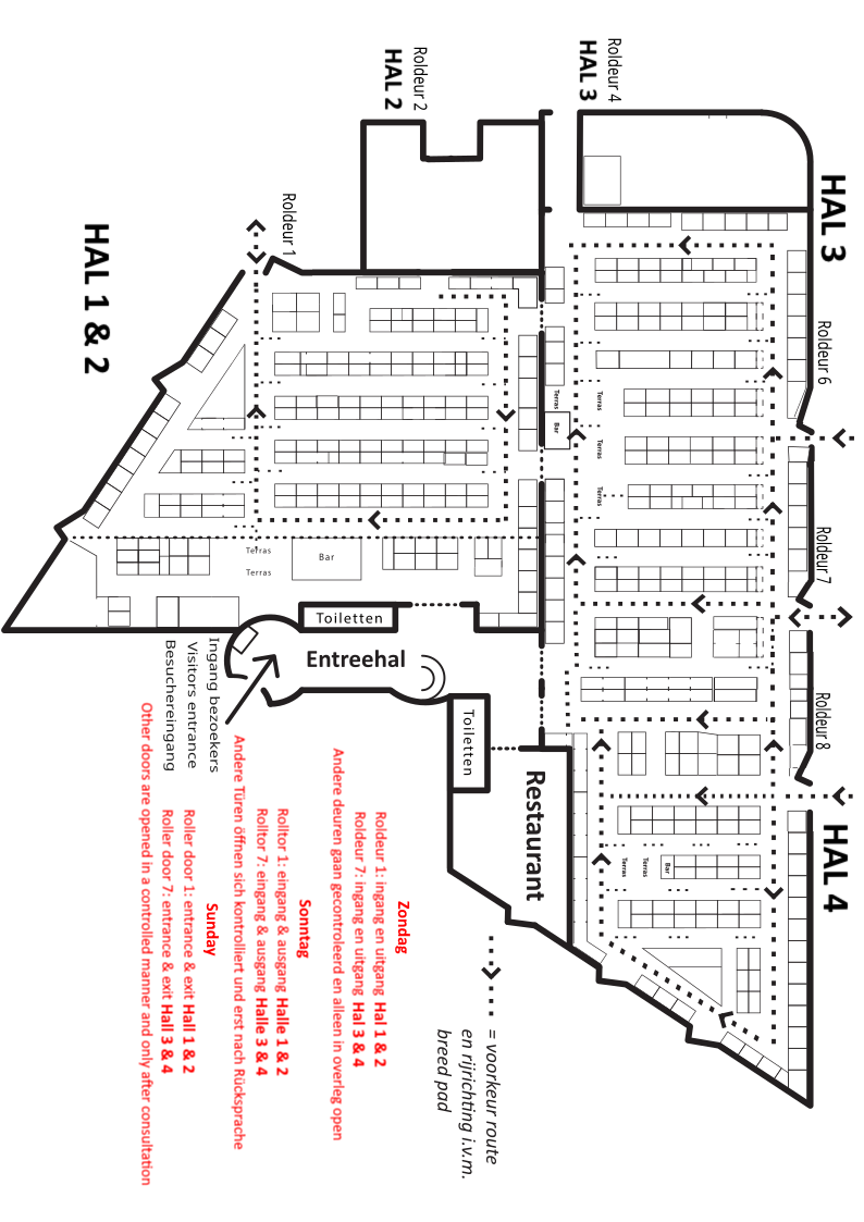 In den Expo Houten Hallen gibt es Teppichböden. Für Motoren und Mopeds ist eine Ölsammlung erforderlich, für die die Organisation Teppichfliesen zur Verfügung stellt. Lose Teile, die auf dem Boden ausgestellt sind, sollten sich auf einem Segeltuch befinden, das der Teilnehmer selbst mitgebracht hat.