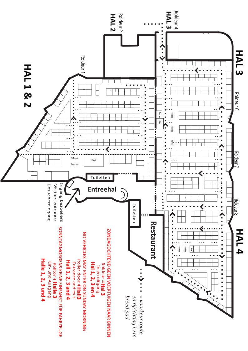 Standhöhe maximal 3,50 Meter. Die Stände können mit einem Auto oder Lieferwagen (bis zu 3.500 kg) und einem Anhänger beliefert werden. Anbieter mit einem Lieferwagen oder LKW über 3.500 kg dürfen NICHT in die Hallen und sollten beim Registrieren mit der Organisation beratschlagen.